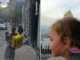 ერთი ადამიანი უკან ეკიდება მეორე მძღოლის კაბინაში შედის.