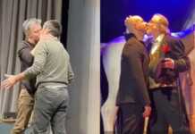მუსიკისა და დრამის თეატრის მამაკაცმა მსახიობებმა სპექტაკლში "შეყრა", თორნიკე გოგრიჭიანისა და კახა კინწურაშვილის მხარდასაჭერად, ერთმანეთს აკოცეს.